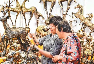 9月23日,在廣西南寧舉行的第十六屆中國—東盟博覽會(huì)上,“一帶一路”相關(guān)國家的參展商帶來的商品吸引眾多參觀者前來選購。圖為參觀者在南寧國際會(huì)展中心選購巴基斯坦青銅器。新華社記者 曹祎銘 攝