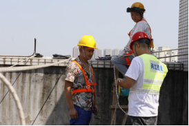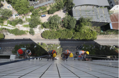 10:16,另一棟樓的天臺,經(jīng)過連日的高溫烘烤,難得的庇蔭處也燥熱難耐。安全監(jiān)督員小陳仔細(xì)檢查每一條承重吊繩的卡扣是否牢固,反復(fù)測試安全鎖的鎖止力度。他介紹到,“高溫會加速金屬部件氧化,每一個卡扣都可能成為生命線的關(guān)鍵節(jié)點!辈贿h(yuǎn)處,老趙踩著木梯微微前傾,將電鎬穩(wěn)穩(wěn)遞向空中,小費伸手接過時,手柄上早已覆上一層細(xì)密的汗珠。兩人的目光在高差中交換,像是完成了一個無需言說的暗號。全員互道“就緒”的話音剛落,“蜘蛛人”小分隊便抓牢繩索,伴著輕微的滑輪轉(zhuǎn)動聲緩緩下降,正式開啟他們今天的第二輪作業(yè)。