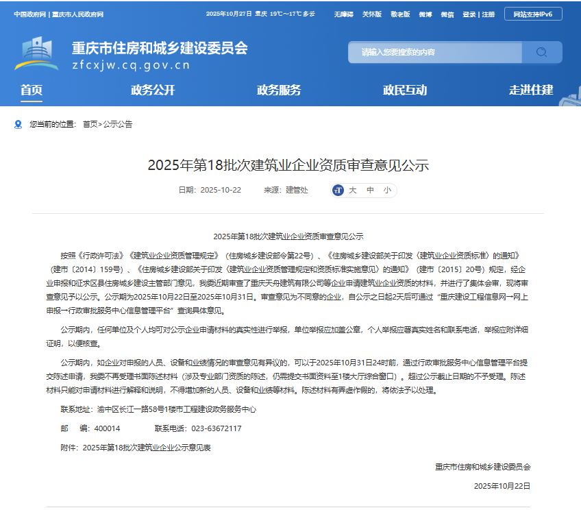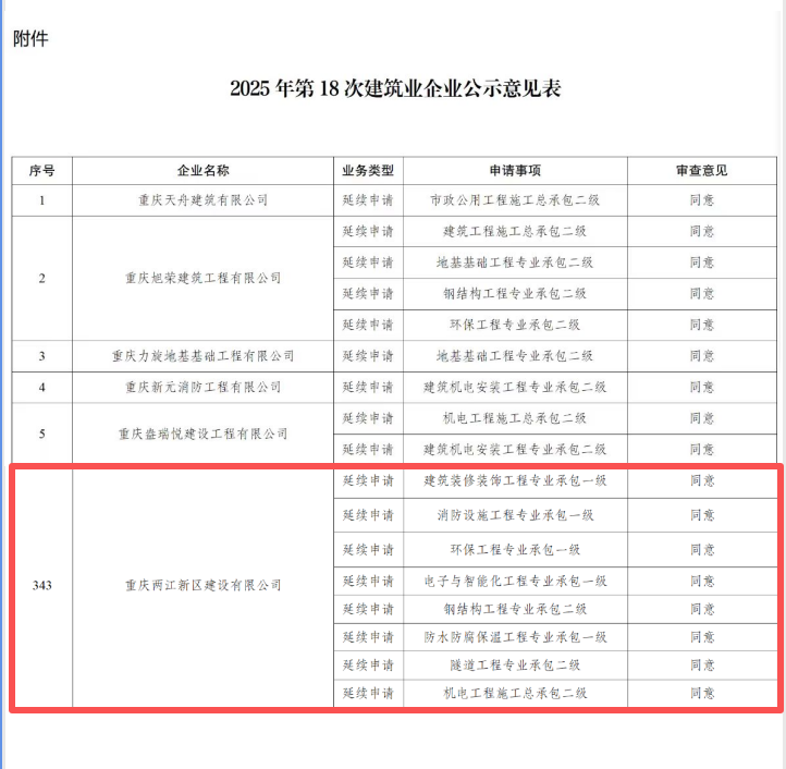 近日,重慶市住房和城鄉(xiāng)建設委員會正式發(fā)布《2025年第18批次建筑業(yè)企業(yè)資質審查意見公示》,重慶兩江新區(qū)建設有限公司申報的建筑業(yè)企業(yè)資質已通過市級主管部門的嚴格審查,進入公示階段。